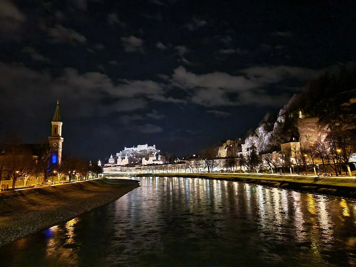 Wenn die Dämmerung über Salzburg fällt, zeigt sich die Stadt von ihrer stillen und besonders stimmungsvollen Seite. Im warmen Schein der Laternen wirken Plätze und Gassen fast wie verwandelt – ruhig, geheimnisvoll und fern vom Trubel des Tages. Besonders reizvoll, wenn die Lichter sich in der Salzach spiegeln.